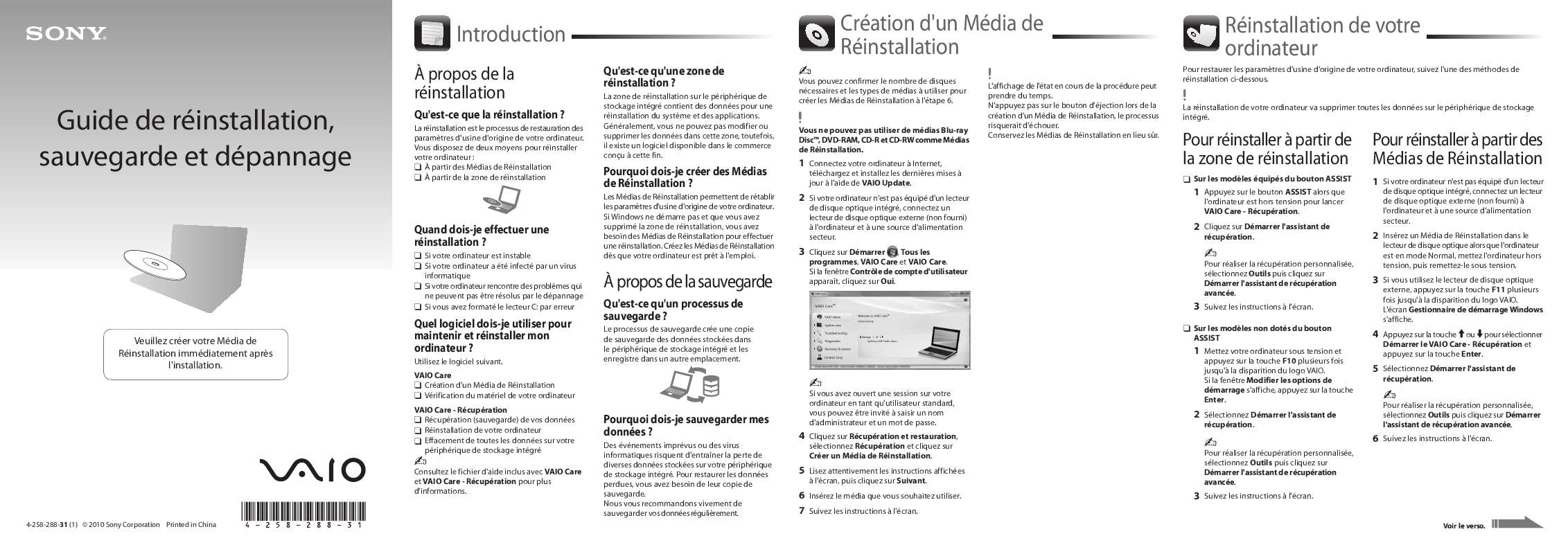 Je ne peux pas créer de Média de Réinstallation Essayez les suggestions ci-dessous : 4 Sélectionnez le système d'exploitation et cliquez sur Suivant. Sauvegardez les fichiers avec Récupération de données si vous avez modifié les fichiers après leur sauvegarde à l'aide de la fonctionnalité de sauvegarde de Windows. 1 2 Redémarrez votre ordinateur. Ensuite, réessayez de créer les Médias de Réinstallation. Téléchargez et installez les dernières mises à jour à l'aide de VAIO Update. Essayez d'autres disques fiables. 5 6 7 Cliquez sur Restauration du système. La fenêtre Restauration du système apparaît. Dans la fenêtre Récupération, cliquez sur Ouvrir la Restauration du système. Si l'option Choisir un autre point de restauration s'affiche dans la fenêtre Restauration du système, sélectionnez-la et cliquez sur Suivant. Sinon, cliquez sur Suivant. Sélectionnez un point de restauration et cliquez sur Suivant. Cliquez sur Terminer pour confirmer le point de restauration. Redémarrez votre ordinateur si la fenêtre vous y invite. Je ne peux pas terminer le processus de réinstallation Déconnectez de l'ordinateur tout périphérique Restauration de vos données à l'aide d'un point de restauration Un point de restauration permet de restaurer les fichiers système de votre ordinateur à l'état précédent qui existait au moment de la création du point de restauration. Généralement, un point de restauration est créé automatiquement, par exemple lorsque vous installez un pilote. Nous recommandons toutefois de créer le point de restauration manuellement dans la fenêtre Panneau de configuration avant d'installer tout logiciel ou des pilotes sur votre ordinateur. externe non nécessaire. Essayez les suggestions ci-dessous : 1 Si vous tentez de réinstaller votre ordinateur à partir des Médias de Réinstallation, vérifiez que les médias ne sont ni sales, ni endommagés. Si les médias ne sont pas propres, nettoyez-les et essayez à nouveau de réinstaller l'ordinateur. Réinstallez votre ordinateur à partir de la zone de réinstallation ou des Médias de Réinstallation. Si le problème persiste, visitez le site Web de support VAIO en ligne pour une assistance complémentaire. 8 9 2 3 correctement raccordé à une source d'alimentation, qu'il est sous tension et que le témoin d'alimentation est allumé. Assurez-vous que le module batterie est correctement installé et chargé. [...] 6 Pour réaliser la récupération personnalisée, sélectionnez Outils puis cliquez sur Démarrer l'assistant de récupération avancée. Suivez les instructions à l'écran. 3 Suivez les instructions à l'écran. Voir le verso. 4-258-288-31 (1) © 2010 Sony Corporation Printed in China Sauvegarde et restauration de vos données Dépannage Si vous rencontrez des problèmes de fonctionnement de votre ordinateur Essayez ces suggestions avant de contacter un centre de service/support Sony agréé ou votre revendeur Sony local. Utilisez des informations de dépannage de cette section ou le Guide de l'utilisateur en ligne. Lancez VAIO Care et effectuez les opérations nécessaires. Visitez le site Web du support en ligne VAIO. Pour sauvegarder et restaurer vos données lorsque que vous pouvez démarrer Windows Si vous pouvez démarrer Windows, sauvegardez et restaurez vos données avec les fonctionnalités de Windows. Pour utiliser ces fonctionnalités, cliquez sur Démarrer, Panneau de configuration, Système et sécurité et Sauvegarder et restaurer. Pour restaurer des fichiers système à l'aide du point de restauration lorsque vous ne pouvez pas démarrer Windows 1 2 3 Suivez les étapes 1 à 3 dans « Pour réinstaller à partir des Médias de Réinstallation » de Réinstallation de votre ordinateur au recto. Appuyez sur la touche ou pour sélectionner Windows RE et appuyez sur la touche Enter. Sélectionnez une disposition du clavier et cliquez sur Suivant. Si la disposition de clavier appropriée n'est pas sélectionnée, vous risquez de ne pas pouvoir entrer le mot de passe correctement. Problèmes liés à la réinstallation Je ne peux pas réinstaller à partir de la zone de réinstallation Réinstallez votre ordinateur à partir des Médias de Réinstallation si vous avez utilisé un logiciel pour modifier la zone de réinstallation, installé un système d'exploitation différent du système préinstallé ou formaté le périphérique de stockage intégré sans utiliser VAIO Care - Récupération. Problèmes courants Mon ordinateur ne démarre pas Assurez-vous que votre ordinateur est Le témoin d'alimentation vert s'allume, mais l'écran reste vide Appuyez sur les touches Alt+F4 à plusieurs Pour sauvegarder et restaurer vos données lorsque que vous ne pouvez pas démarrer Windows Lorsque vous ne pouvez pas démarrer Windows, sauvegardez vos données avec VAIO Care - Récupération. [...]..