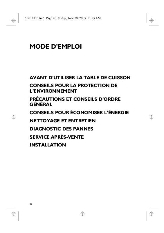 DÉCLARATION DE CONFORMITÉ CE • Ces appareils sont conçus pour entrer en contact avec les aliments et répondent aux exigences de la Directive 89/109/CEE. Ces appareils sont conçus exclusivement comme appareils de cuisson. Toute autre application de ces appareils (pour chauffer une pièce, par exemple) sera considérée comme impropre et potentiellement dangereuse. Ces appareils sont conçus, fabriqués et mis sur le marché conformément aux : - objectifs de sécurité de la Directive “Basse tension” 73/23/CEE, - exigences de protection de la Directive “CEM” 89/336/CEE, - objectifs de la Directive 93/68/CEE. [...] • CONSEILS POUR LE RESPECT DE L’ENVIRONNEMENT 1. Emballage • L’emballage se compose de matériaux entièrement recyclables et porte le symbole de recyclage ( ). Produits • L’appareil est fabriqué à partir de matériaux recyclables. Lors de la mise au rebut, veuillez agir de manière responsable et respecter les normes en vigueur en matière d’élimination des déchets. Rendez l’appareil inutilisable en coupant le câble d’alimentation. MESURES DE PRÉCAUTION ET CONSEILS D’ORDRE GÉNÉRAL • • Avant de procéder à l’entretien, veillez à débrancher le four. Maintenez les enfants à distance du four lorsque celui-ci est en service, ou immédiatement après l’avoir mis hors service. La réparation et le réglage du four sont exclusivement réservés à un technicien qualifié. Veillez à ce que le câble électrique d’autres appareils électroménagers se trouvant à proximité immédiate ne puisse ni entrer en contact avec les parties chaudes, ni se coincer dans la porte du four. Utilisez des maniques pour retirer les plaques à pâtisserie et les accessoires du four chaud. Evitez de couvrir le fond du four avec des feuilles d’aluminium. Ne stockez pas des produits inflammables dans le four. Ces produits risqueraient en effet de s’enflammer si le four était mis en service par inadvertance. Le four est équipé d’un système de refroidissement à air afin d’éviter que l’avant du four et la carrosserie ne surchauffent. Lorsque vous avez cuit à des températures de 200° C ou plus pendant plus d’une heure, il est recommandé de respecter une période de refroidissement pour éliminer la chaleur résiduelle du four et de la carrosserie. A la fin de la cuisson, laissez le four en marche pendant environ 15 minutes, sur n’importe quelle fonction sauf Gril, avec le bouton du thermostat sur “0”...