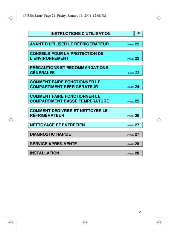 • Conservez les liquides dans des récipients fermés. Attention La conservation de légumes à haute teneur en eau peut provoquer la formation de condensation sur la plaque en verre dans le bac à fruits et légumes. Ceci ne porte pas préjudice au fonctionnement correct de l’appareil. 24 6Fr33015. fm5 Page 25 Friday, January 19, 2001 12:08 PM COMMENT FAIRE FONCTIONNER LE COMPARTIMENT BASSE TEMPÉRATURE Le compartiment basse température est à , ou à. Dans les compartiments à ou il est possible de conserver des aliments surgelés pendent toute la période indiquée sur l’emballage. Si le compartiment basse température est à , il est aussi possible d’y congeler les aliments frais. La quantité d’aliments frais qu’il est possible de congeler en 24 heures est indiquée sur la plaque signalétique. Remarque : Le compartiment basse température maintient la température appropriée pour la conservation des aliments, même en cas de coupure de courant. Il est toutefois recommandé, en cas de coupure de courant, d’éviter d’ouvrir la porte du compartiment. • immédiatement les aliments surgelés dans le compartiment basse température. Ne recongelez pas les aliments partiellement décongelés, mais consommez-les dans un délai de 24 heures. Évitez ou réduisez au maximum les variations de température. Respectez la date de péremption indiquée sur l’emballage. Suivez toujours les instructions figurant sur l’emballage pour la conservation des aliments congelés. Remplissez le bac à glaçons aux 2/3 et placez-le dans le compartiment basse température. Si le bac est collé au fond du compartiment basse température, n’utilisez pas d’objets pointus ou tranchants pour le décoller. Pour sortir plus facilement les glaçons du bac, pliez légèrement ce dernier. • • Production de glaçons • • Congélation des aliments frais (uniquement dans le compartiment • ). Important • Enveloppez hermétiquement les aliments frais à congeler dans : des feuilles de papier aluminium, une pellicule transparente, des emballages plastiques imperméables, des récipients en polyéthylène à couvercle, des récipients adaptés à la congélation des aliments. [...] Déclaration de conformité Cet appareil est destiné à entrer en contact avec des denrées alimentaires et est conforme à la Directive Européenne 89/109/CEE. Information Pour les appareils avec Isobutane (R600a) L’isobutane est un gaz naturel qui est sans danger pour l’environnement, mais il est inflammable. Il est donc indispensable de vous assurer que les tuyaux du circuit de réfrigération sont en parfait état. MAÎTRISE DE LA TEMPÉRATURE Stockez les aliments les plus sensibles dans la zone la plus froide de l’appareil, conformément aux indications figurant dans cette notice. • Attendez le complet refroidissement des préparations avant de les stocker (exemple : soupe). • Limitez le nombre d’ouvertures de la porte. • Positionnez la commande de réglage du thermostat de façon à obtenir une température plus basse. Ce réglage doit se faire progressivement afin de ne pas provoquer le gel des denrées. 23 6Fr33015. fm5 Page 24 Friday, January 19, 2001 12:08 PM COMMENT FAIRE FONCTIONNER LE COMPARTIMENT RÉFRIGÉRATEUR Mise en service de l’appareil Mise en marche de l’appareil L’appareil est doté de commandes intérieures. Branchez l’appareil. Lorsque l’appareil est branché, l’éclairage intérieur s’allume à l’ouverture de la porte réfrigérateur. Le thermostat, situé dans le compartiment réfrigérateur de l’appareil, permet de régler la température du compartiment réfrigérateur et celle du compartiment basse température (si présent). Réglage de la température 1. Pour un fonctionnement correct et une meilleure conservation des aliments, il est conseillé de régler le thermostat comme indiqué sur la fiche jointe. Remarque : La température ambiante, la fréquence d’ouverture de la porte et la position de l’appareil peuvent influer sur la température intérieure du réfrigérateur. Les positions du thermostat doivent varier en fonction de ces facteurs. Conservation des aliments dans le compartiment réfrigérateur Rangez les aliments comme indiqué sur la figure. A Aliments cuits B Poissons, viandes C Fruits et légumes D Bouteilles E Fromages Remarques : • L’espace entre les clayettes et la paroi intérieure arrière du réfrigérateur permet à l’air de circuler librement. • Ne disposez pas les aliments en contact direct avec la paroi arrière du compartiment réfrigérateur. [...]..